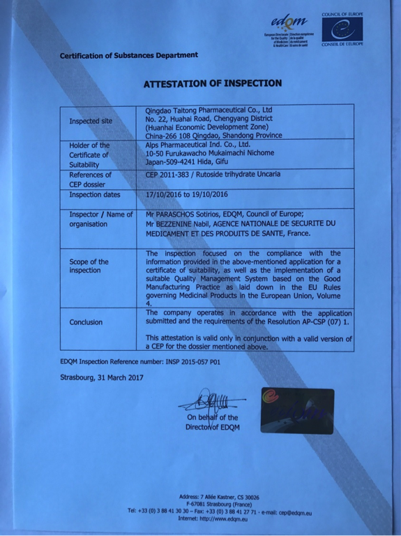 2017年3月取得蘆丁歐盟EDQM及法國(guó)GMP證書(shū)